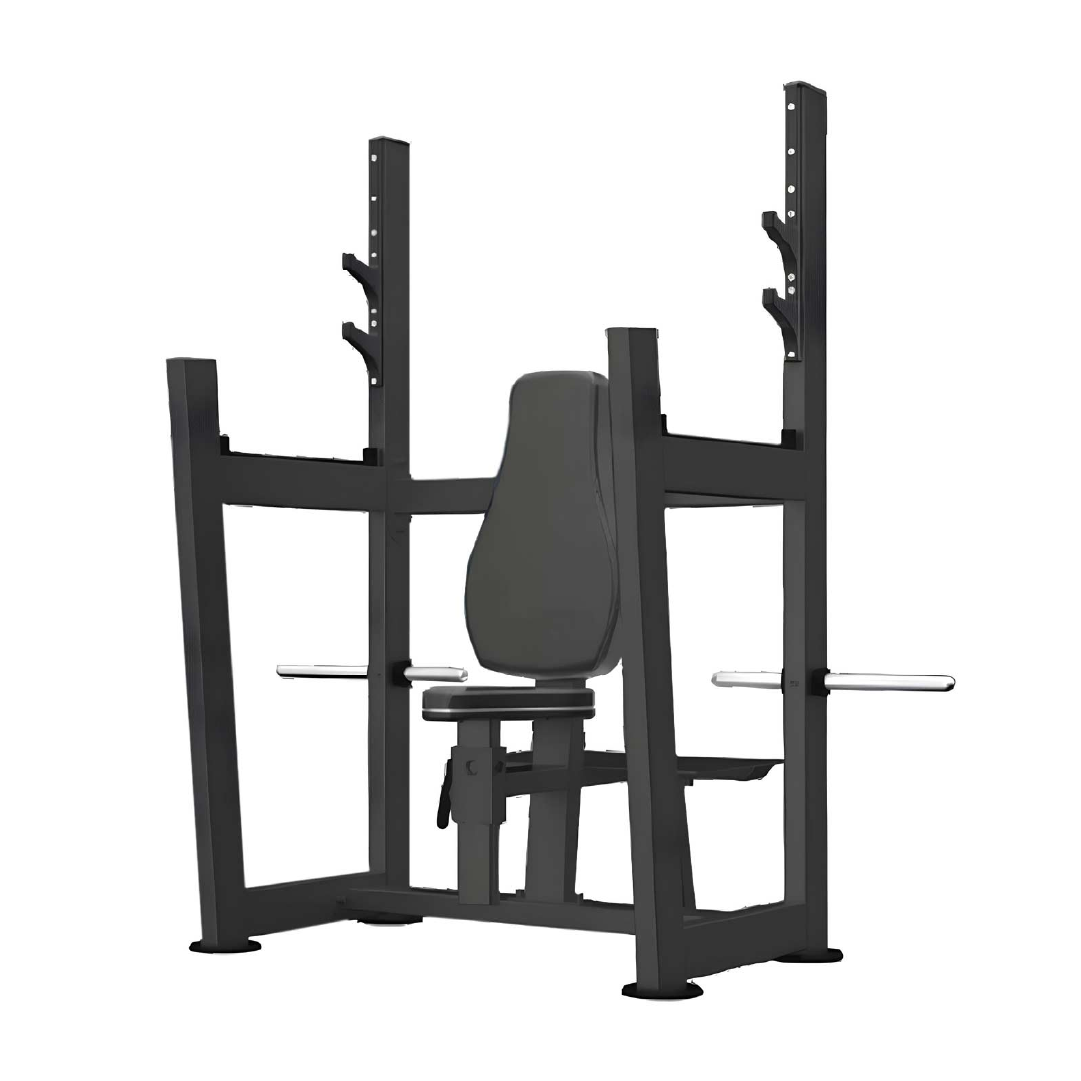 BANCO OLÍMPICO DE HOMBRO – S18, equipo profesional para entrenamientos de fuerza en hombros y tríceps. Estructura robusta de acero con asiento y respaldo acolchados.