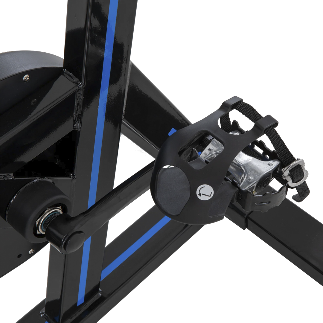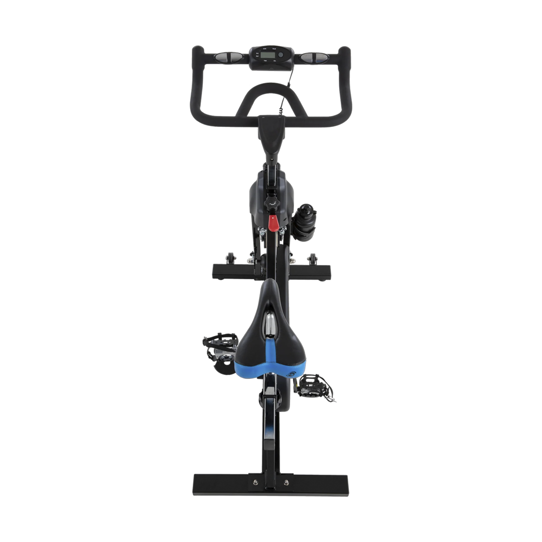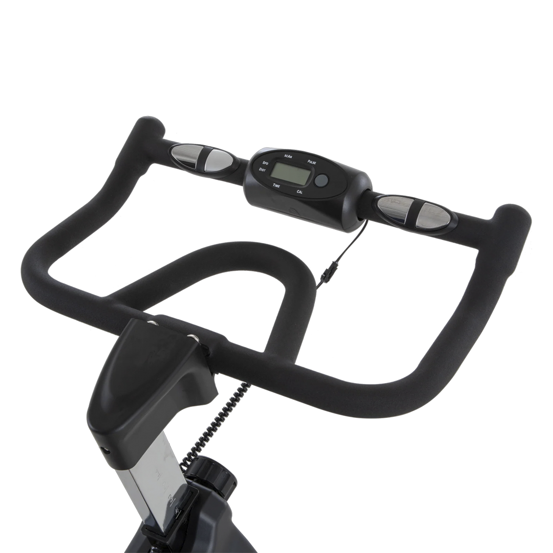 El monitor integrado muestra velocidad, distancia, calorías, tiempo y pulsaciones de ritmo cardiaco, permitiendo un seguimiento claro del rendimiento y progreso en cada sesión. Los pedales de aluminio con puntera aseguran estabilidad y agarre firme durante el ejercicio.