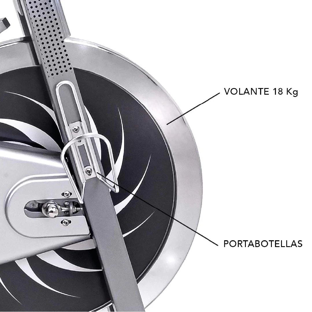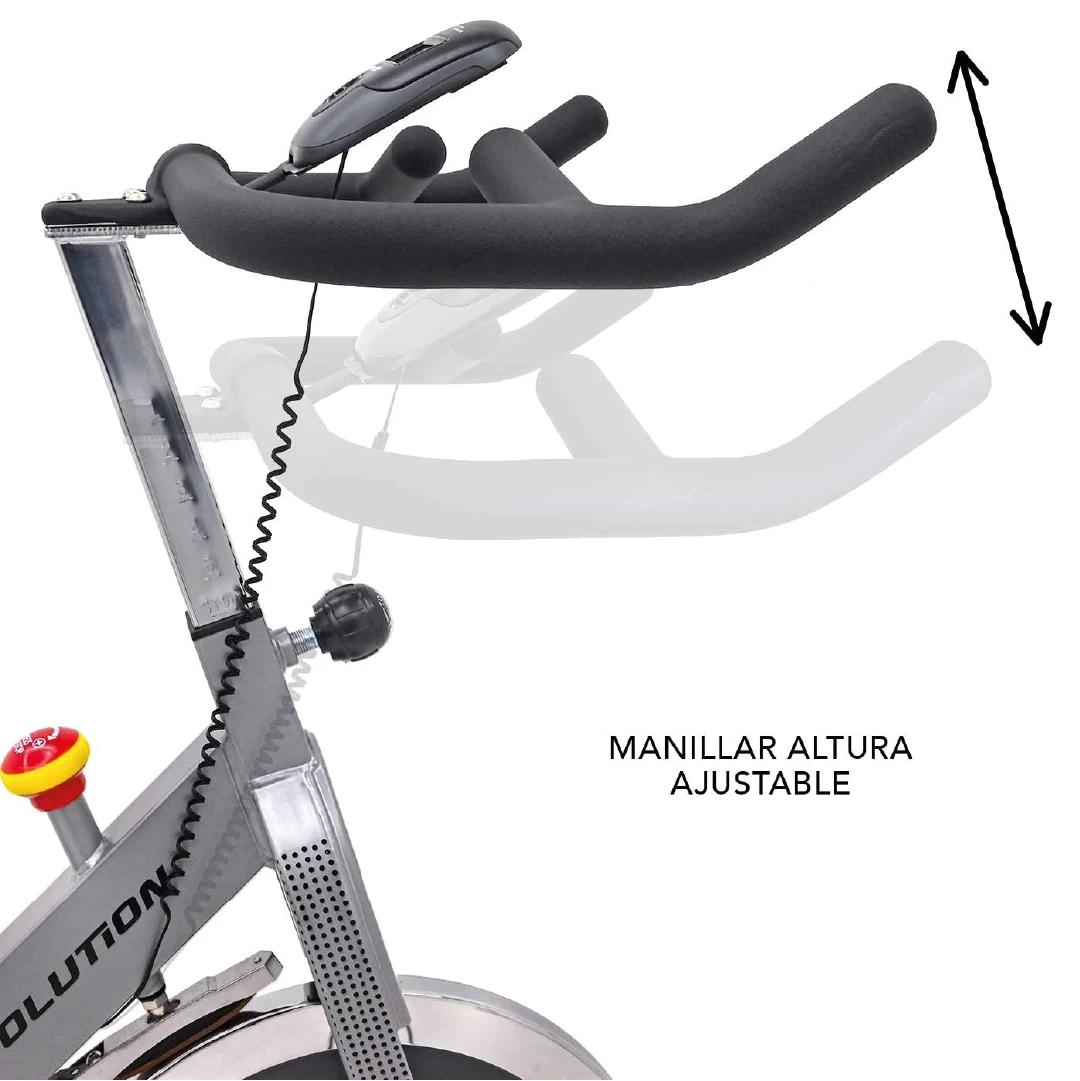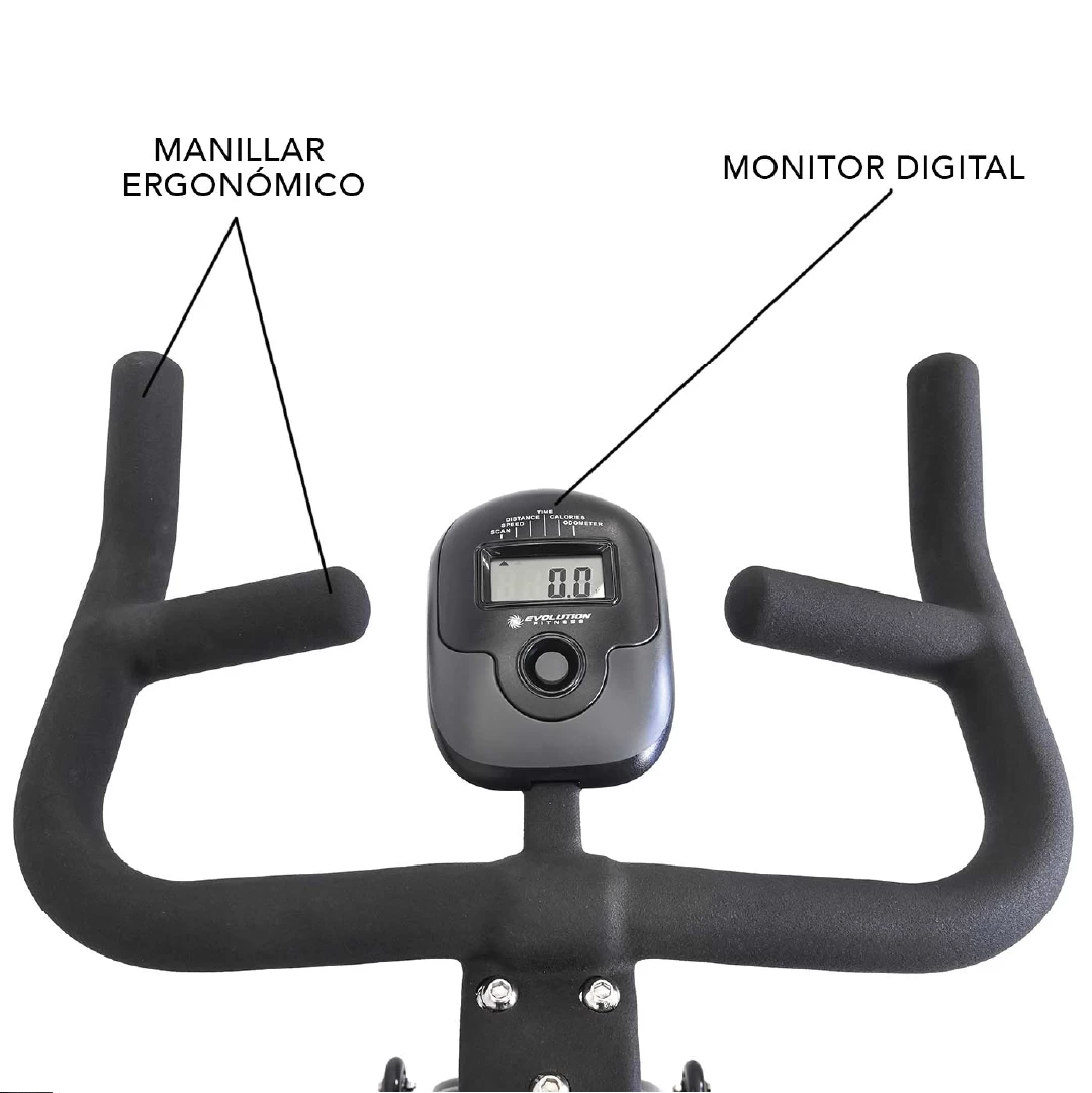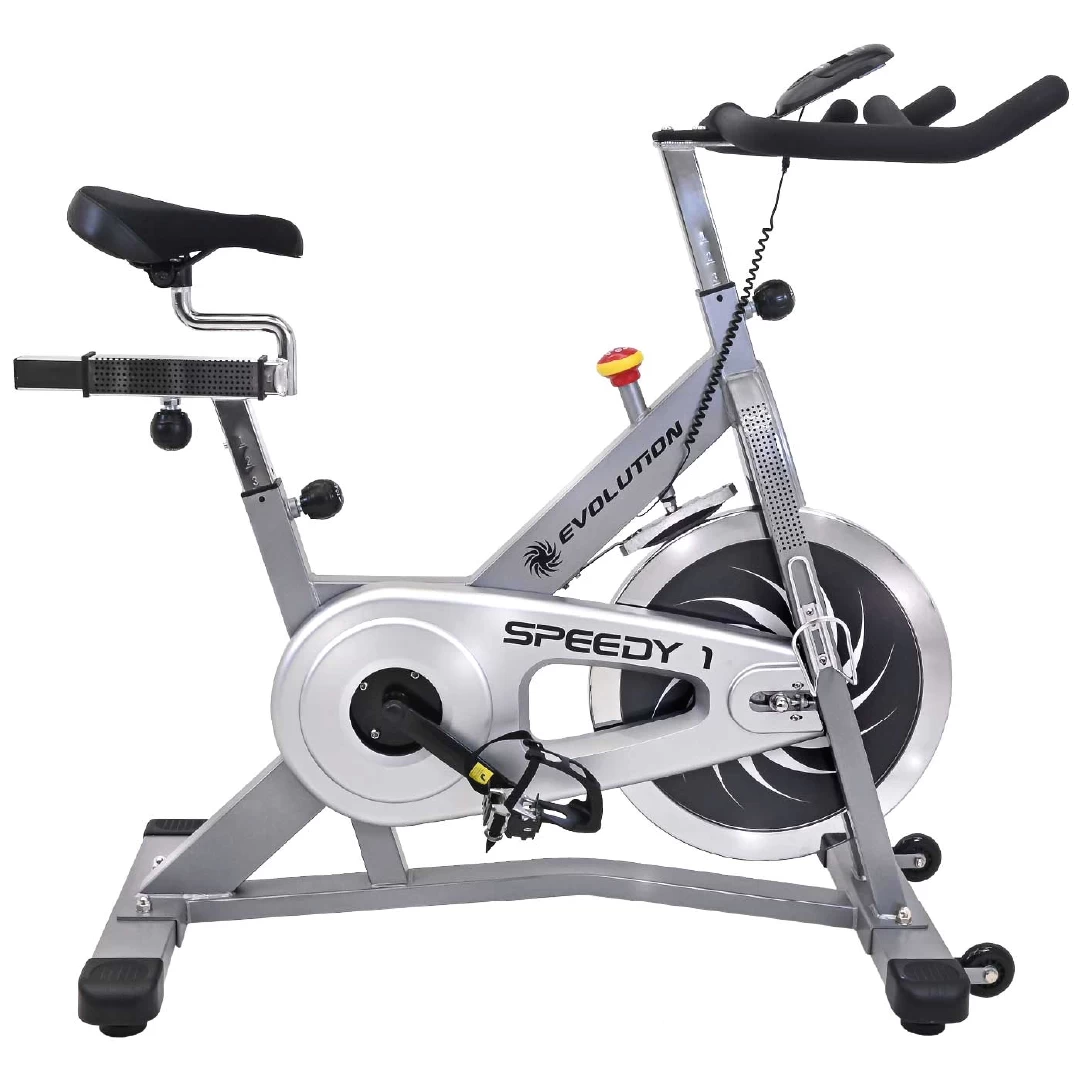 La Speedy 1 de Evolution es una bicicleta de spinning profesional con volante de 20 kg, diseño robusto y componentes ajustables para sesiones de cardio y tonificación intensas en casa o en entornos institucionales.