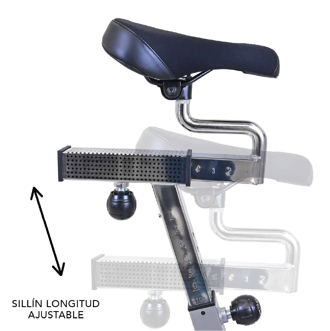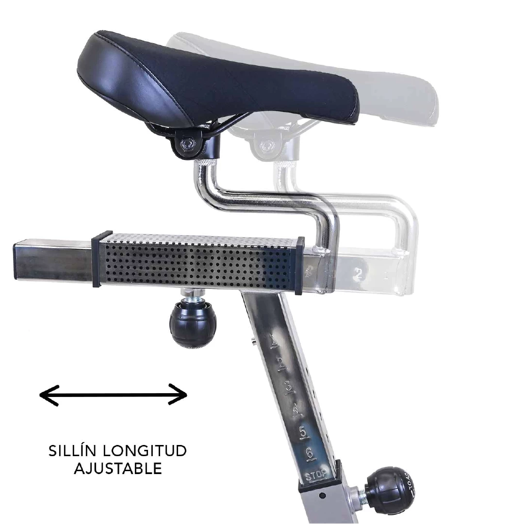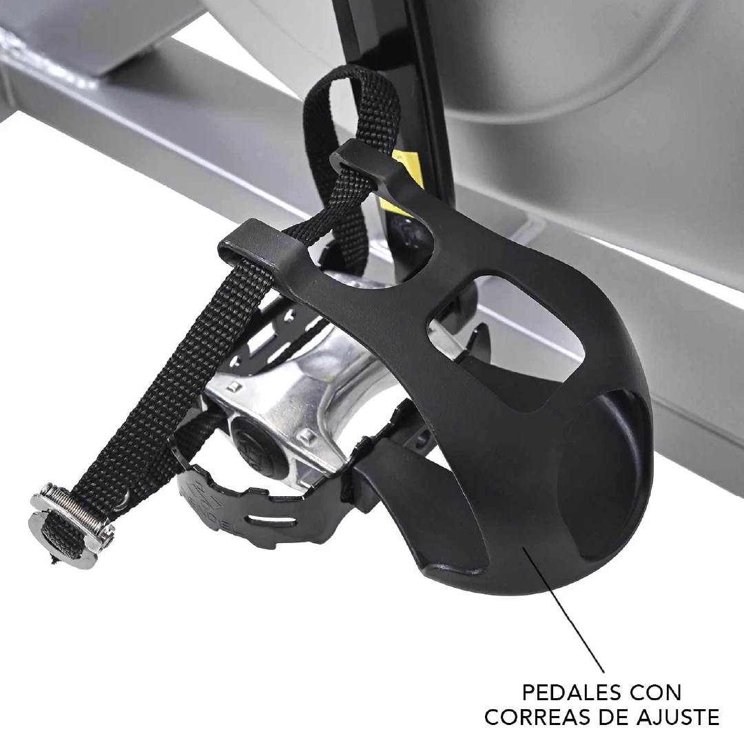 Esta bicicleta soporta hasta 120 kg de usuario y cuenta con un sillín ajustable vertical y horizontalmente, así como un manillar sumergible con múltiples posiciones de agarre, adaptándose a distintas morfologías y estilos de pedaleo. Los pedales de aluminio aseguran eficiencia y larga vida útil.