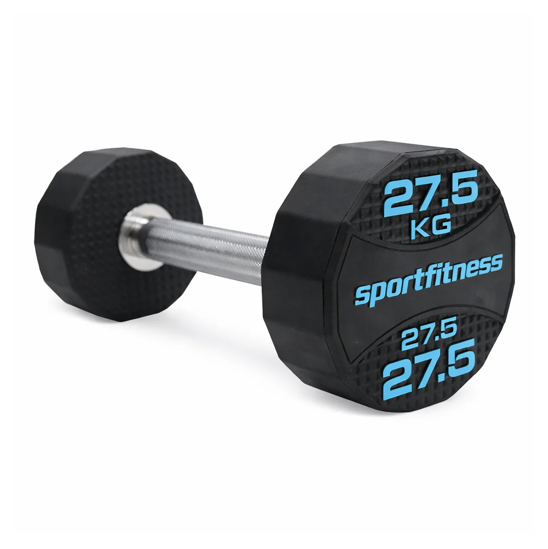 Por otra parte, su recubrimiento en caucho de alta calidad ofrece múltiples ventajas. Por un lado, amortigua impactos y reduce el ruido, lo que permite entrenar en diferentes entornos sin generar molestias. Por otro lado, protege tanto la mancuerna como las superficies de contacto, prolongando la vida útil del equipo.