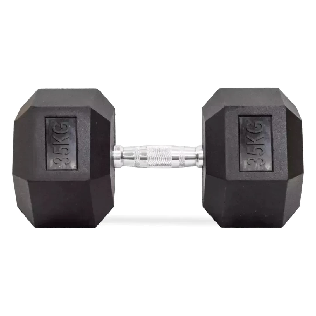 La Mancuerna Encauchetada Hex 35kg es un equipo profesional con hierro fundido acerado, mango cromado antideslizante y recubrimiento de caucho inyectado, ideal para entrenamientos avanzados de musculación y resistencia.