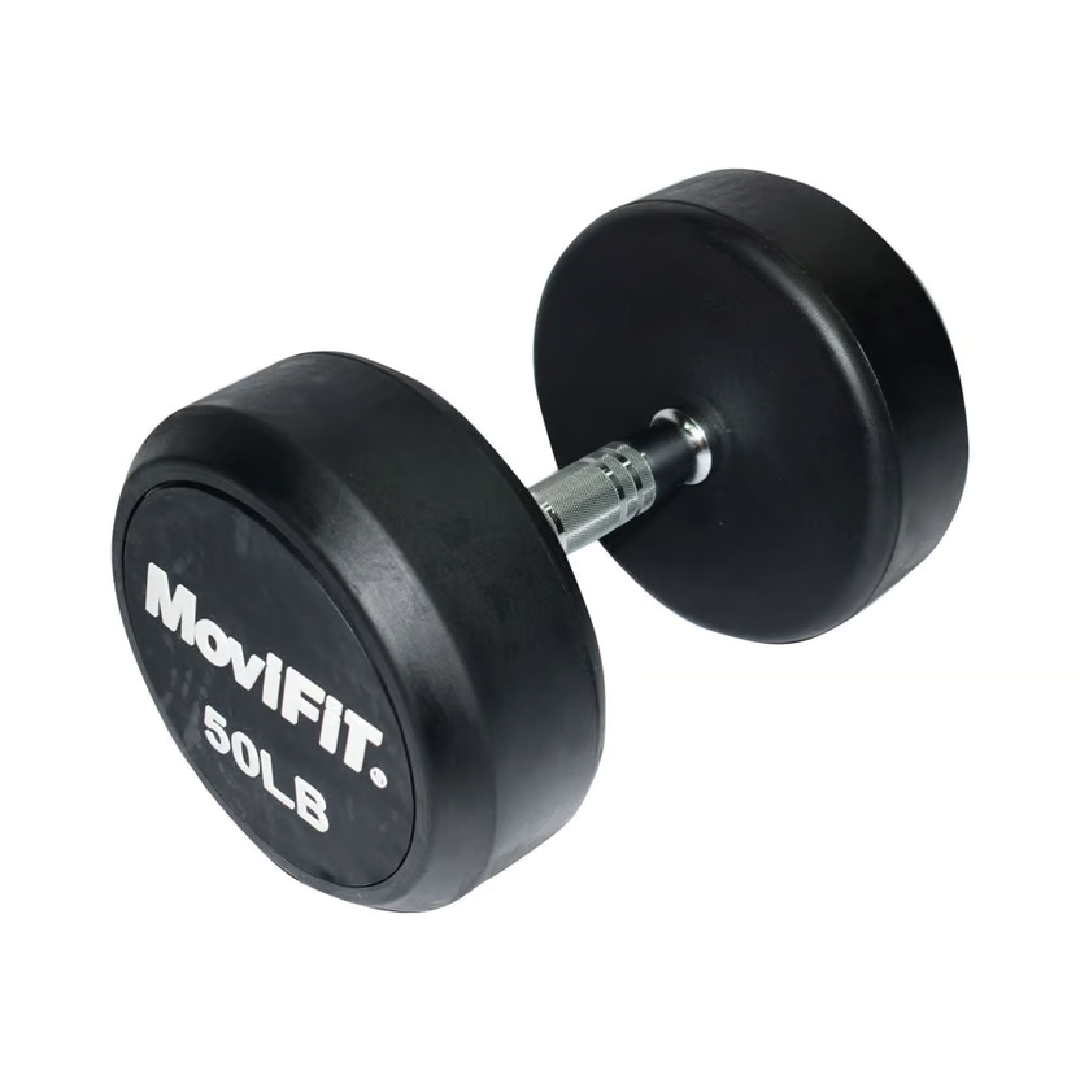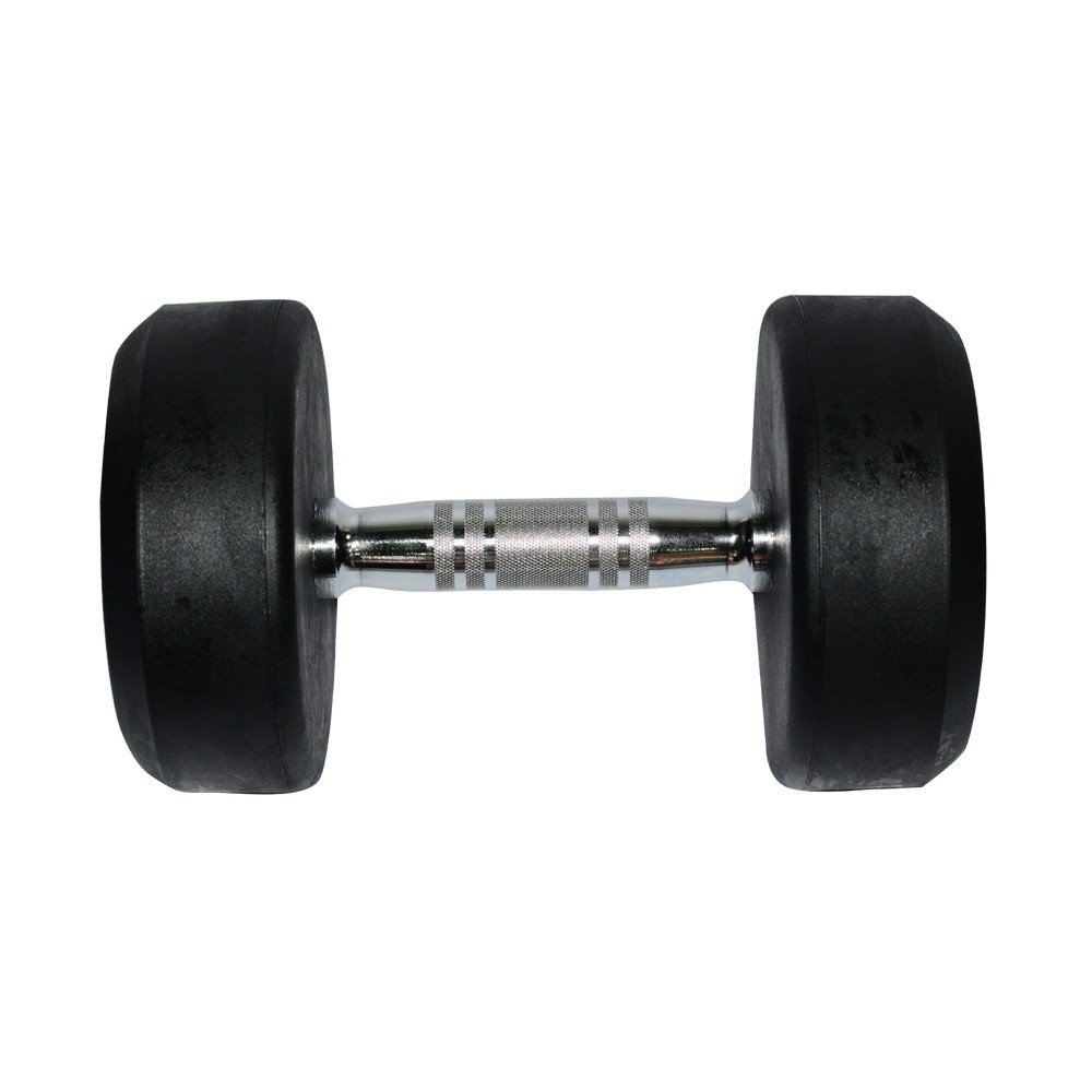 La Mancuerna Redonda Encauchetada de 50 lb es ideal para entrenamientos de fuerza intensivos, diseñada para uso en hogar, gimnasios e instituciones.
