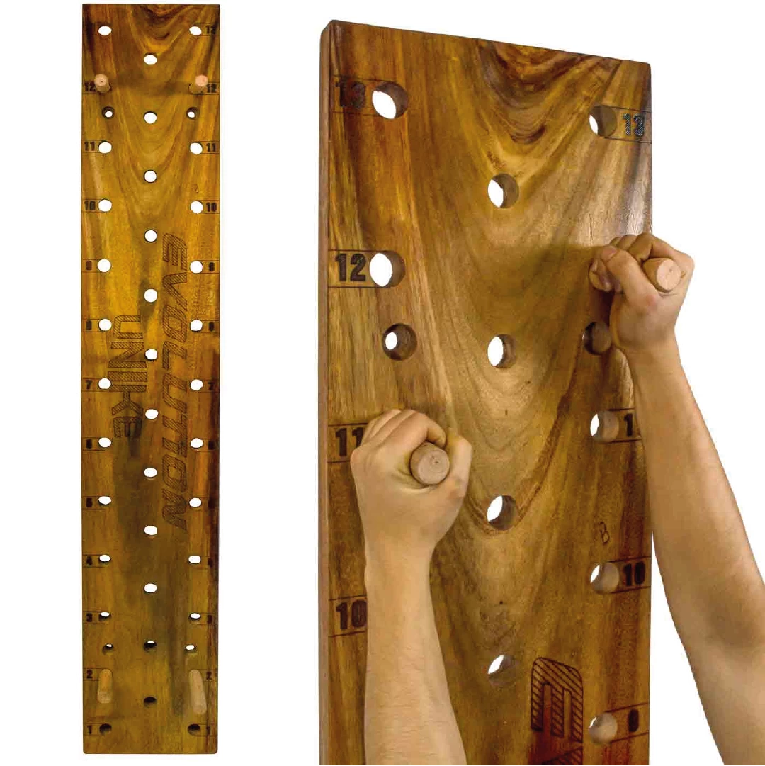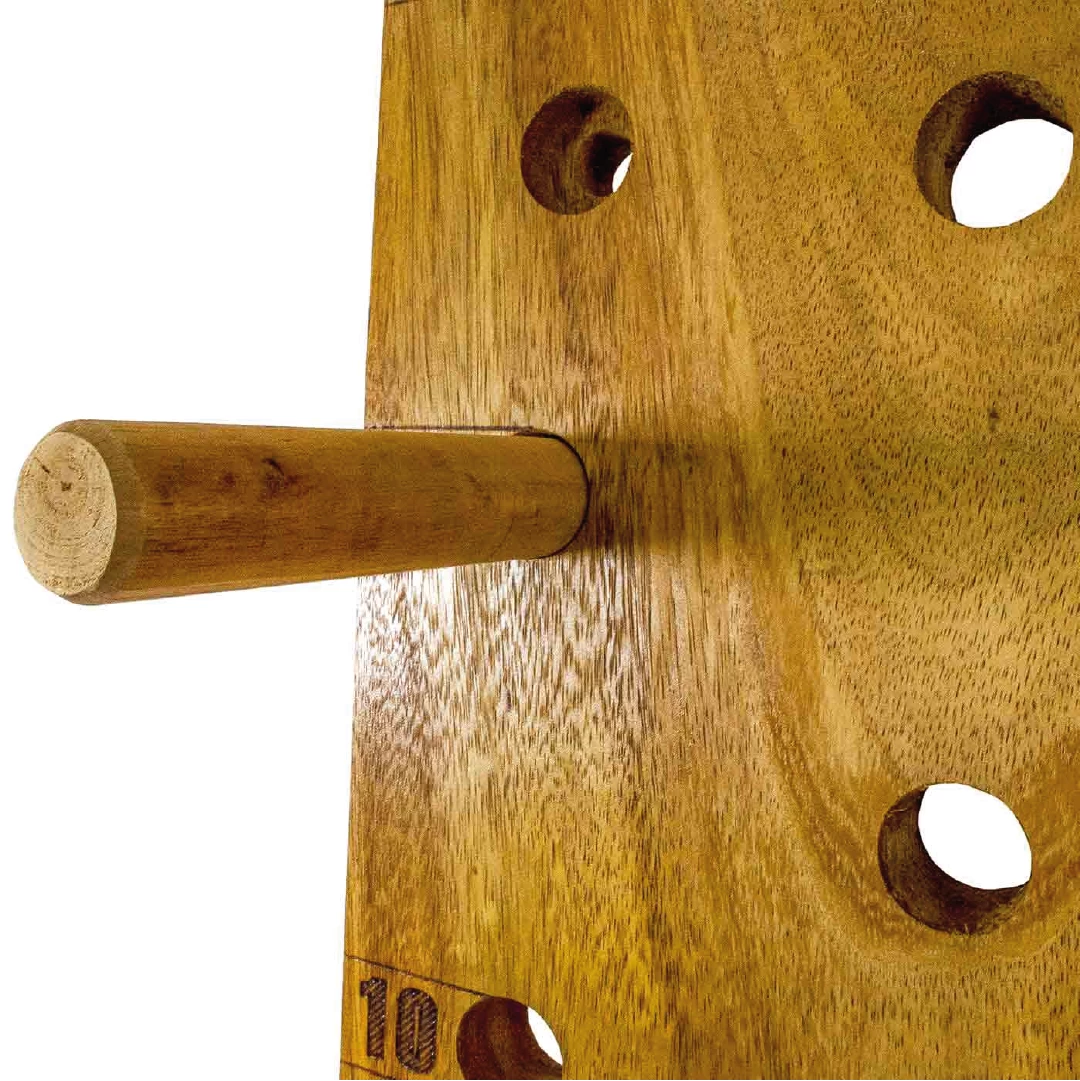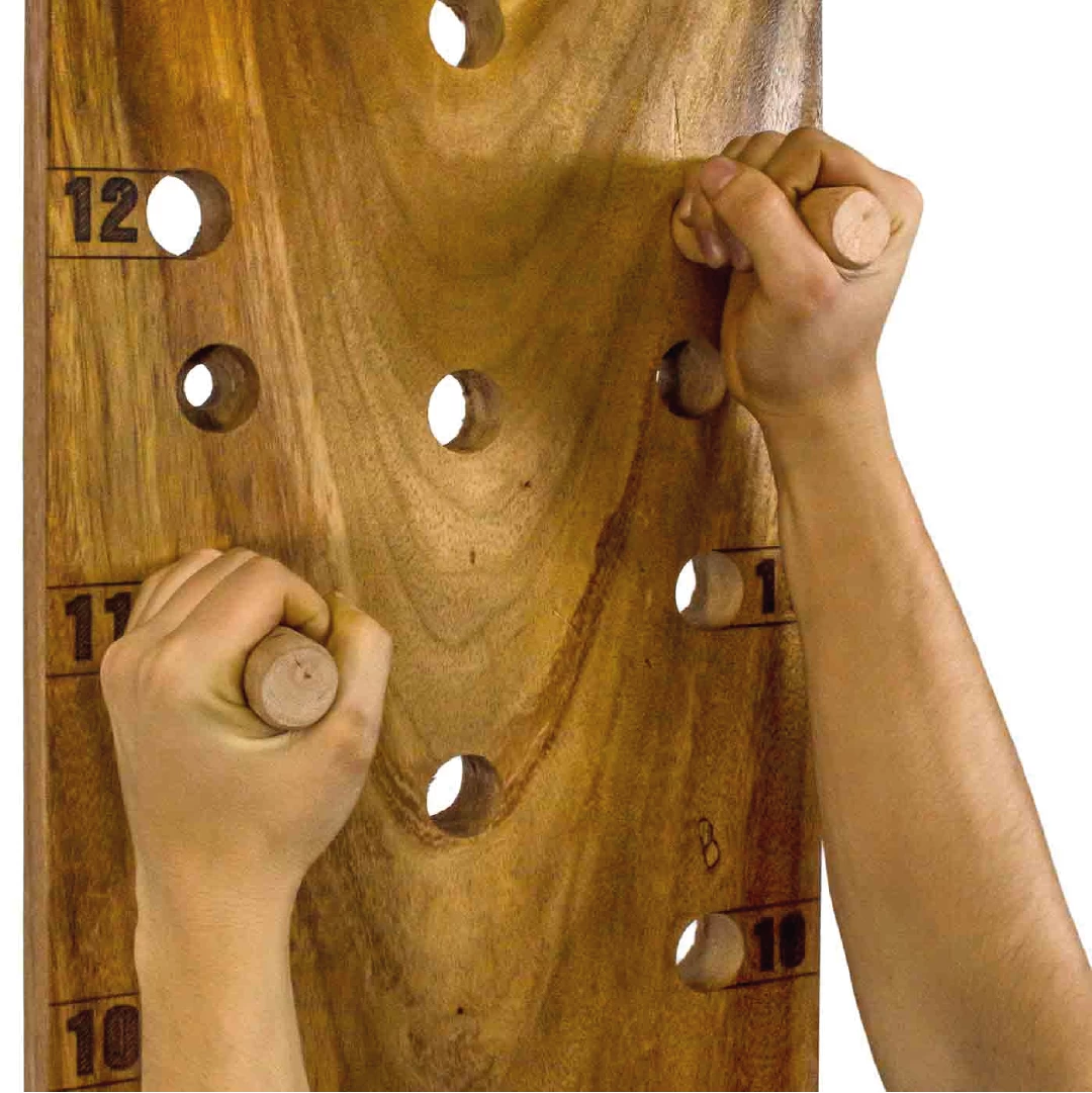 Este tablero cuenta con 38 perforaciones distribuidas estratégicamente, permitiendo una amplia variedad de rutas de desplazamiento, niveles de dificultad y patrones de agarre. Además, incluye dos barras de madera diseñadas ergonómicamente para facilitar un agarre cómodo, firme y seguro durante el ejercicio.